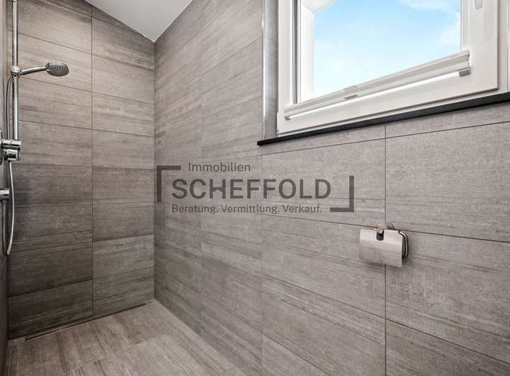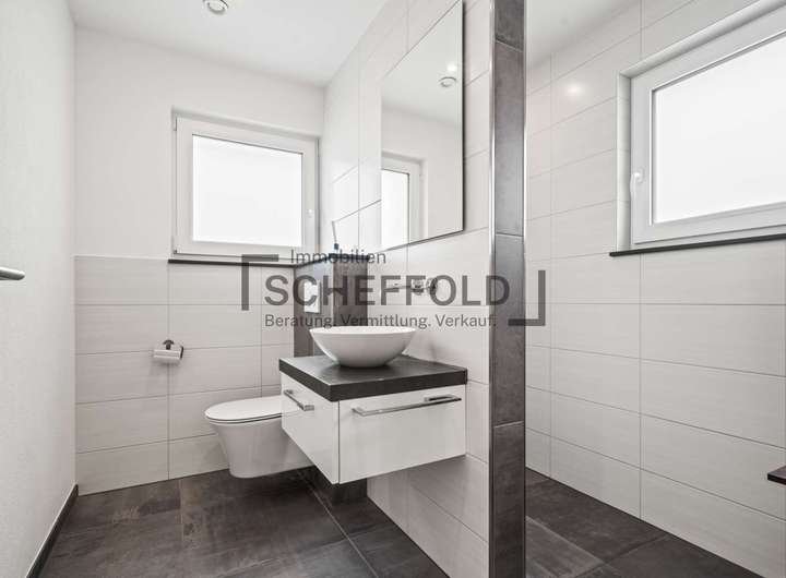 Ein weiterer Raum im Erdgeschoss lässt sich flexibel nutzen – ob als Büro, Gästezimmer oder Abstellraum – und rundet das Raumangebot ebenso ab wie das stilvolle Gästebadezimmer mit Dusche, Waschbecken und WC sowie der funktional gelegene Hauswirtschaftsraum mit Anschlüssen für Waschmaschine und Trockner.