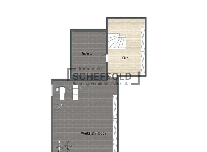 Im unterkellerten Bereich befindet sich neben dem Technikraum auch ein weiterer großer Raum unter der Garage, der derzeit als Hobbyraum bzw. Werkstatt genutzt wird. In der Vergangenheit kam es hier an einer Ecke zur Außenwand zu einem Feuchtigkeitsproblem, dessen Ursache beseitigt wurde, der Bereich jedoch weiterhin beobachtet werden sollte.
