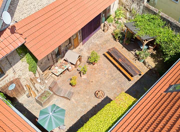 Der Innenhof mit Südausrichtung und zusätzlichem Garten lädt zum Verweilen ein und bietet Privatsphäre sowie ausreichend Platz für Familie, Freunde oder Gäste.