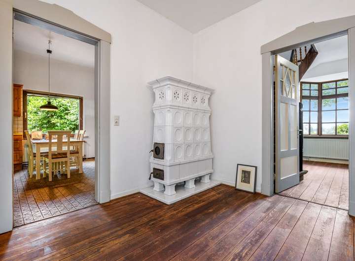 Die Hauptvilla aus dem Jahr 1870 verfügt über eine Wohnfläche von ca. 141 m², verteilt auf vier großzügige Zimmer. Sie wurde über die Jahre hinweg liebevoll gepflegt und instand gehalten, wobei stets darauf geachtet wurde, den originalen Charakter des Hauses zu bewahren. Die lichtdurchfluteten Räume, die beeindruckend hohen Decken sowie zahlreiche historische Details – viele davon über ein Jahrhundert alt – verleihen dem Haus einen besonderen Charme und eine gemütliche Atmosphäre.