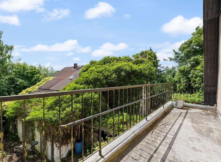Über eine massive stilvolle Echtholz-Treppe erreichen Sie das Obergeschoss, wo ein schöner Flur in ein großzügiges Zimmer mit eigenem Balkon und angrenzendem Duschbad führt. Eine kleine, integrierte Küchenzeile macht dieses Zimmer besonders flexibel nutzbar. Ein weiteres großes Zimmer ergänzt das Raumangebot im Obergeschoss.