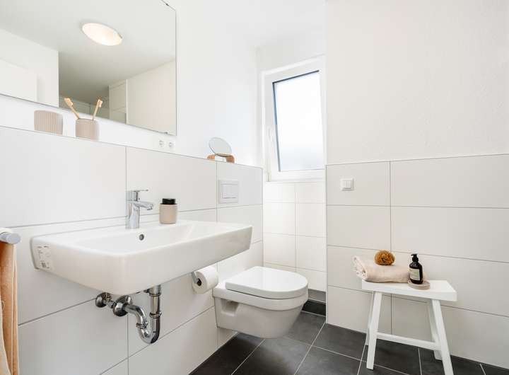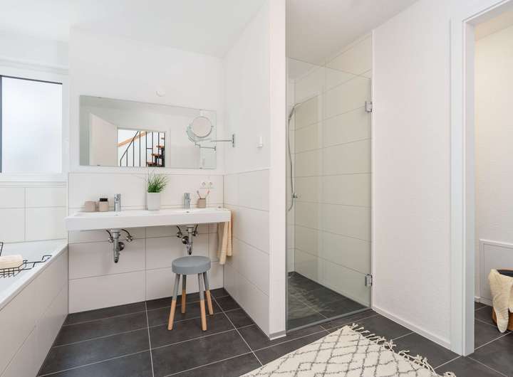 • Komfortable Badausstattung: Die bodengleiche geflieste Dusche mit Echtglastrennwänden und Spiegel in allen Bädern sowie eine moderne Sanitärausstattung und einem Doppelwaschtisch im Hauptbad bieten höchsten Komfort und Funktionalität.