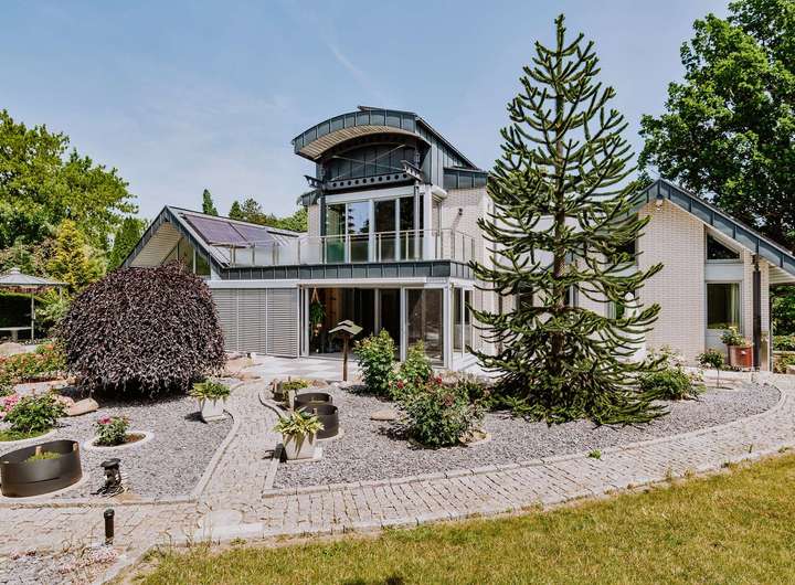 Eingebettet in eine ruhige, naturnahe Idylle präsentiert sich dieses außergewöhnliche Anwesen als wahre Rarität auf dem Immobilienmarkt – ein Refugium für Menschen mit Sinn für Architektur, Ästhetik und nachhaltige Lebensqualität. Über eine private Brücke, die sich elegant über einen kleinen Flusslauf spannt, gelangt man auf das rund 4.693 m² große, park ähnlich angelegte Grundstück – eine Welt für sich, eingefasst von altem Baumbestand und einer Atmosphäre voll natürlicher Harmonie und gehobener Privatsphäre. Bereits das elektrisch betriebene Tor unterstreicht den exklusiven Anspruch des Anwesens. Direkt dahinter befindet sich eine großzügige Carport-Anlage, von der aus man den Blick auf zwei architektonisch sehr unterschiedliche, aber in ihrer Gesamtwirkung harmonisch arrangierte Gebäude richtet.