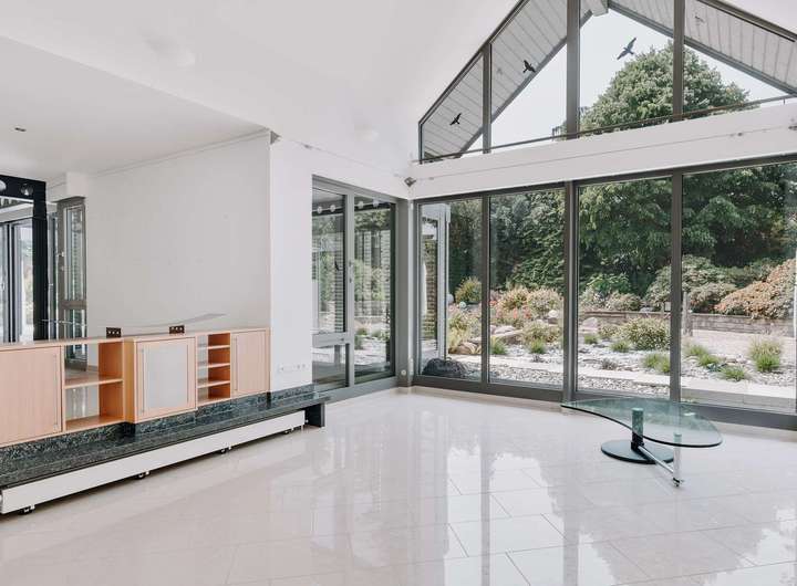 Das Haupthaus mit 219,45m² Wohnfläche bildet das Herzstück des Anwesens. Es wurde im Jahr 1998 als individueller Architektenneubau errichtet und überzeugt mit einer beeindruckenden Kombination aus klarer Linienführung, funktionaler Großzügigkeit und technisch hochwertiger Ausstattung. Schon beim Betreten eröffnet sich ein weiter Eingangsbereich, der auf die architektonische Besonderheit des Hauses einstimmt: eine massive, geschwungene Stahlkonstruktion, die den offenen Wohnbereich bis unter das Dach trägt und diesem Raum eine lichtdurchflutete, fast sakrale Weite verleiht. Riesige Fensterfronten, ein vollständig verglaster Wintergarten sowie stilvolle Fliesenböden vermitteln ein Ambiente aus Klarheit, Qualität und Wohnwärme. Im Erdgeschoss befindet sich ein abgeschlossener Schlaftrakt mit einem großzügigen Ankleidezimmer, zwei Schlafzimmern (aktuell zusammengelegt), sowie einem hochwertigen Vollbad mit Dusche, Wanne und Doppelwaschtisch. Die Küche ist eine Vollholz-Einbauküche mit hochwertigen Miele-Geräten und angrenzender Abstellkammer – ideal für anspruchsvolles Kochen und stilvolles Gastgeben.