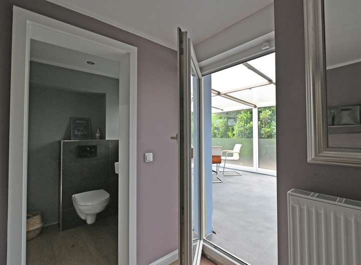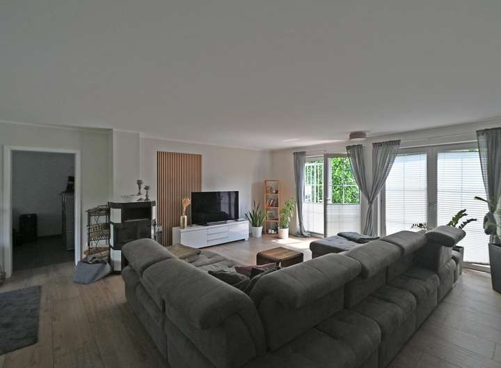 Großzügige Fensterlösungen, im Lebensbereich bodentief, teilweise elektrische Rollläden. Hochwertige Feinsteinfliesen Carpatos in Holzoptik im gesamten Erdgeschoss, im Obergeschoss Vinyl- bzw. Laminatböden. Weiße Landhaustüren, glatt geputzte, gestrichene Wände, Kaminofen im Wohn-/Essbereich, moderne Einbauküche von Siematic mit allen wünschenswerten Elektrogeräten. Sehr schön gestaltete Geschosstreppe mit hellen Massivholzstufen, kombiniert mit einer Stahlkonstruktion in weiß. Zwei helle Tageslichtbäder und zwei Gäste-WCs, ebenfalls mit Tageslicht. Gasheizung. Zwei schön angelegte Gartenteile vor und hinter dem Haus mit großen Terrassenflächen sowie einem Wintergarten. Garage mit vorgelagertem Stellplatz und einer weiteren Stellplatzmöglichkeit.