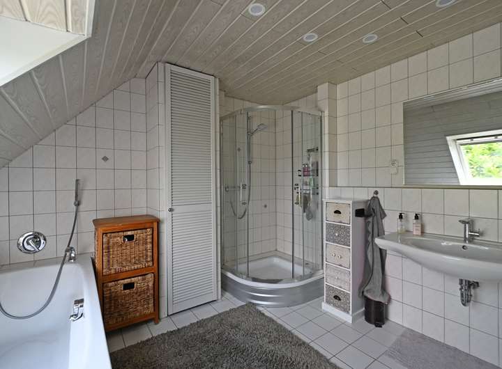 Dachgeschoss: Drei schöne, großzügige Räume, zwei davon mit einer kleinen Diele verbunden. Zwei moderne Tageslicht-Bäder, eines davon als Duschbad, eines mit Wanne und Dusche; außerdem gibt es auf dieser Ebene einen kleinen Hauswirtschaftsbereich.
