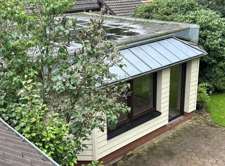 - Satteldach mit Zementpfannen und Zinkrinnen, Anbauten mit Flachdach