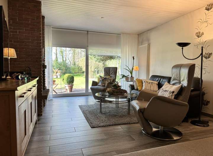 - Wohnzimmer mit offenem Kamin und Hebe-/Schiebetür als Ausgang in den Garten