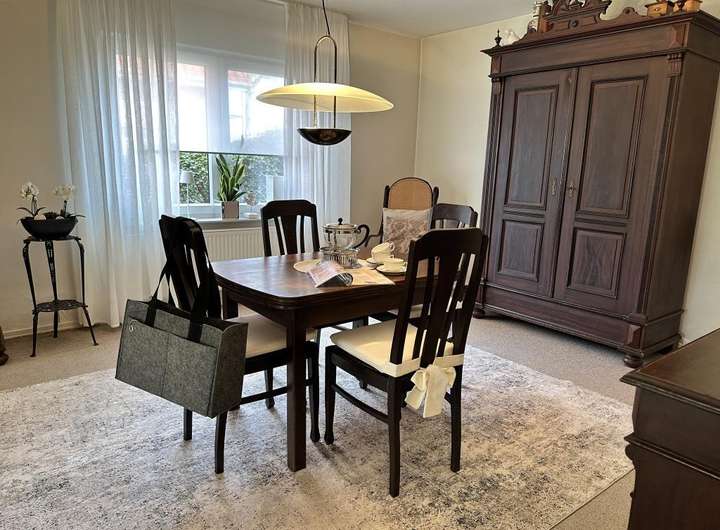 - Bodenbeläge: Holz-, Fliesen- oder Teppich, im Erdgeschoss teilweise auf Holzbalkenlage
