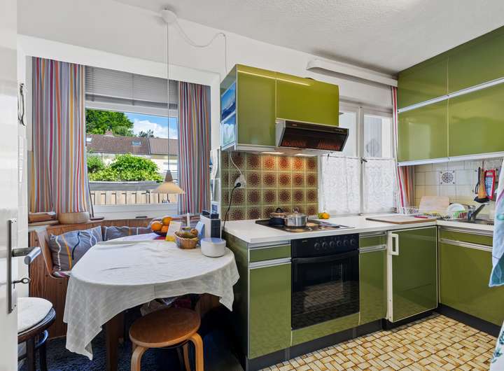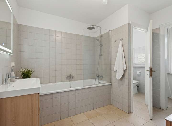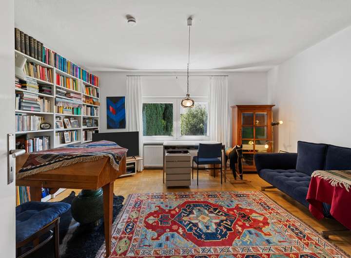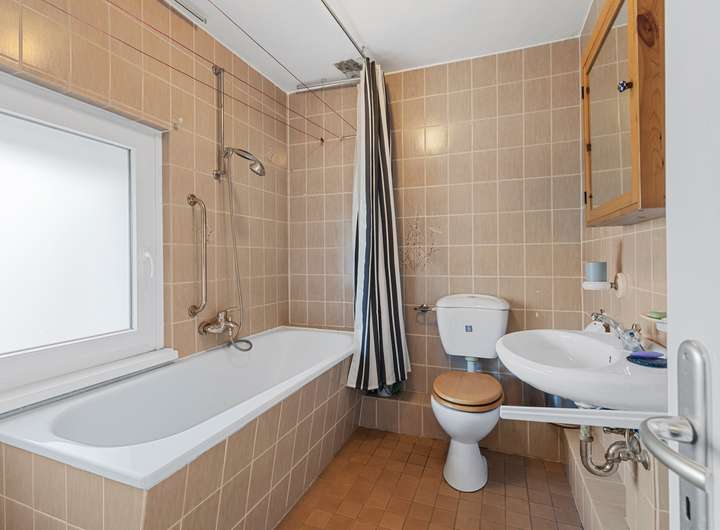 Im Erdgeschoss erwartet Sie eine helle, freundliche Wohneinheit mit direktem Zugang zur halb überdachten Terrasse und dem Garten. Der Wohnbereich mit Kamin schafft eine gemütliche Atmosphäre, die Küche ist funktional geschnitten und ermöglicht einen direkten Übergang in den Essbereich. Zwei weitere Zimmer eignen sich ideal als Schlafzimmer, Kinderzimmer oder Büro. Ein gepflegtes Badezimmer mit Badewanne sowie ein separates WC komplettieren das Raumangebot dieser Einheit.