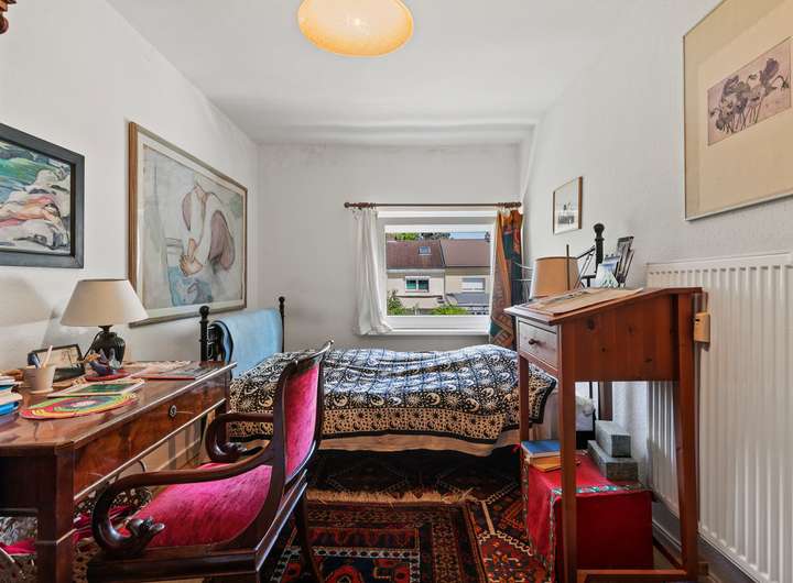 Das Obergeschoss bildet eine in sich geschlossene zweite Wohneinheit, die über das gemeinsame Treppenhaus zugänglich ist. Diese Einheit verfügt über drei Zimmer, eine Küche sowie ein Badezimmer mit Dusche. Besonders hervorzuheben ist das großzügige Wohnzimmer, das durch seine Fensterfront viel Tageslicht erhält. Die beiden weiteren Zimmer bieten flexible Gestaltungsmöglichkeiten für Schlafen, Arbeiten oder Hobbys. Die klare Trennung der beiden Einheiten bietet ebenfalls die Möglichkeit zur separaten Vermietung.