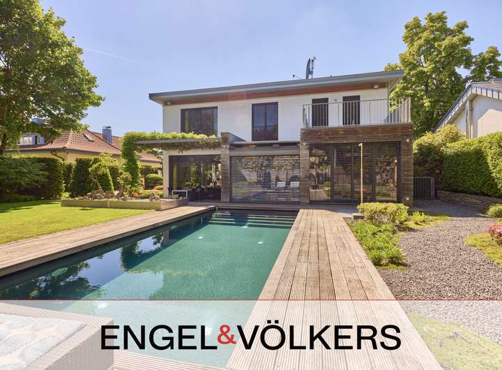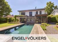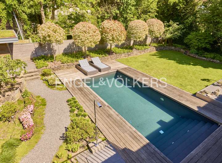 Der Außenbereich beeindruckt mit einem großen, stilvoll angelegten und uneinsehbaren Garten sowie einem Außenpool, der an warmen Tagen für Abkühlung sorgt. Großflächige Terrassen bieten Platz für gesellige und unvergessliche Abende im Loungebereich neben dem Koi-Teich oder unter dem Gründach mit Blick auf den Pool.