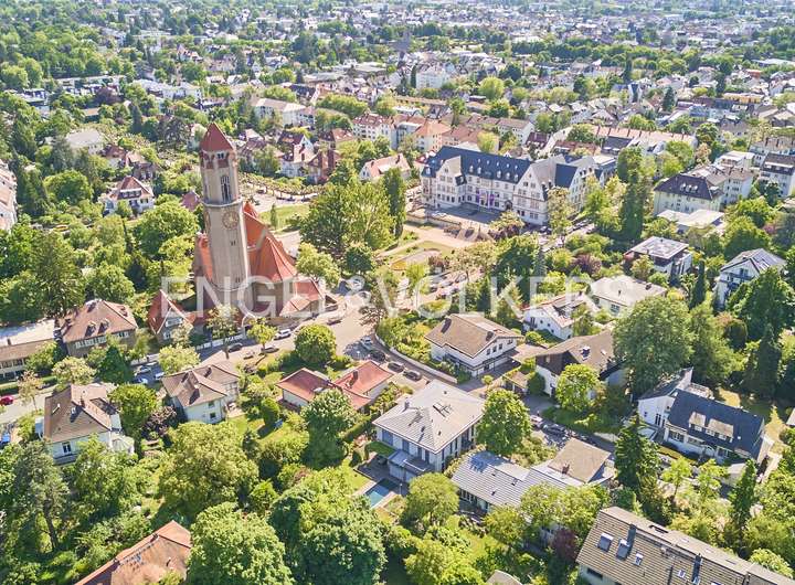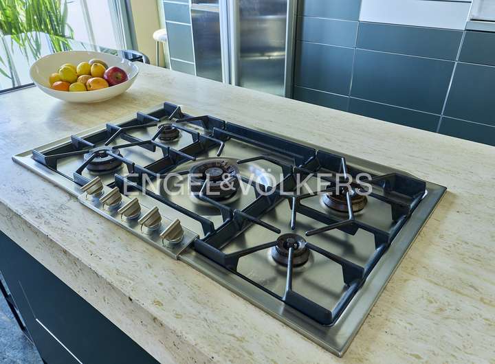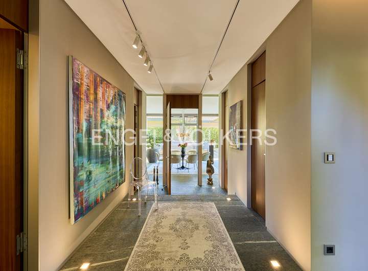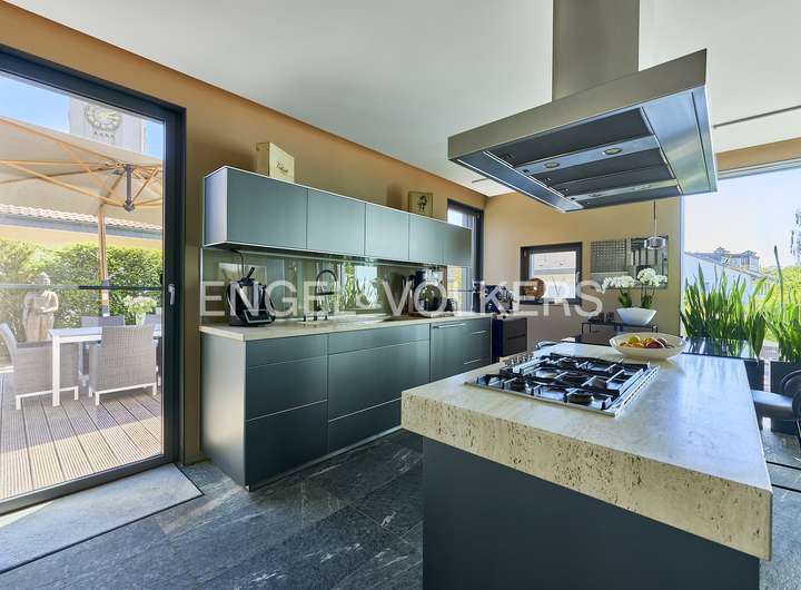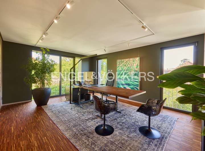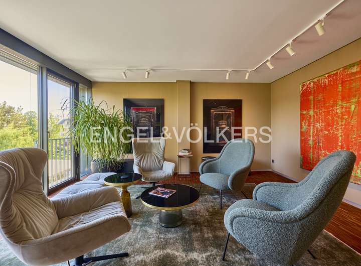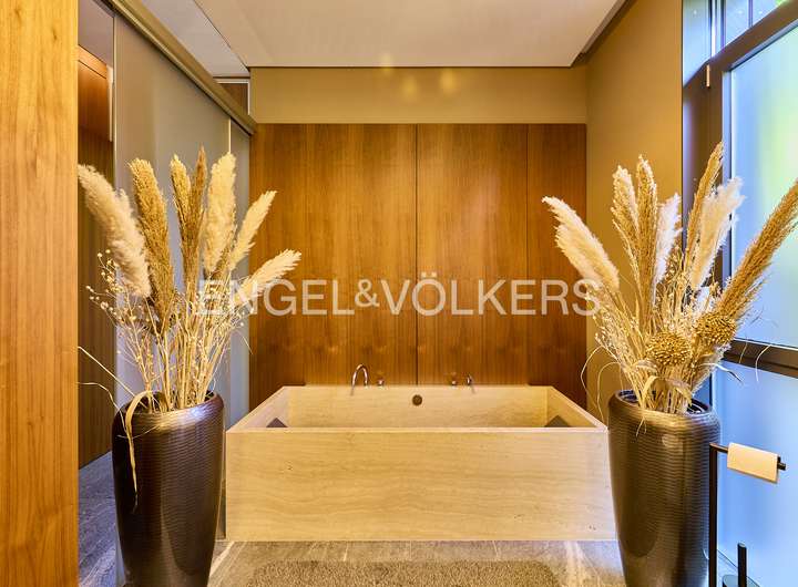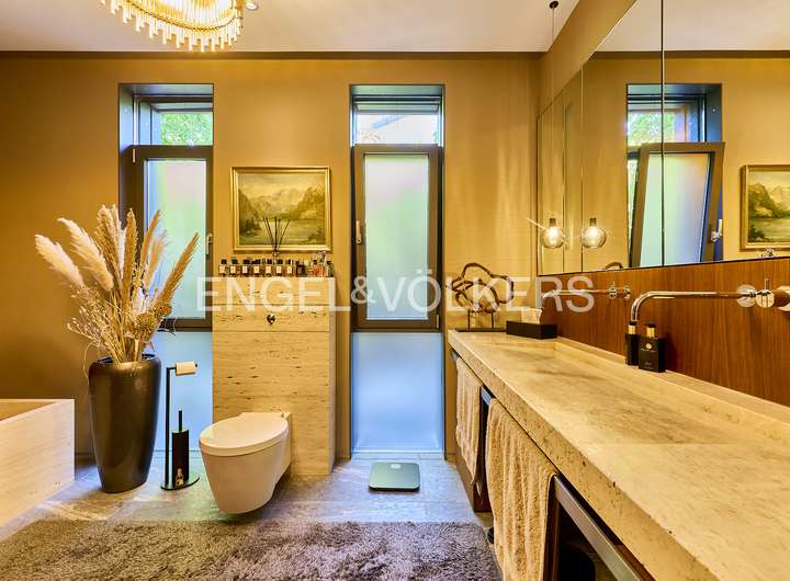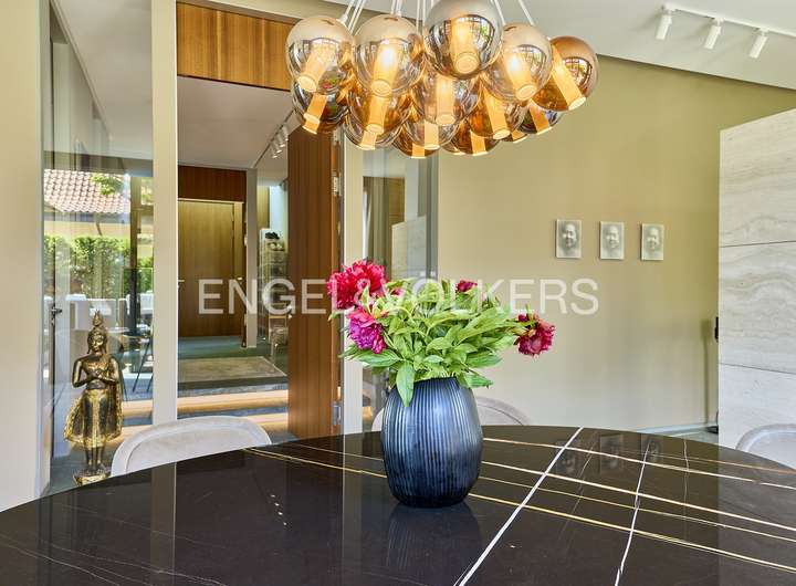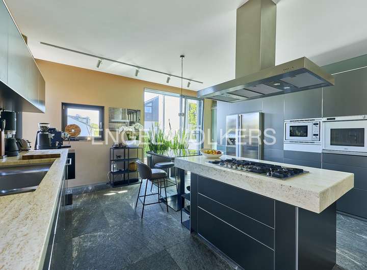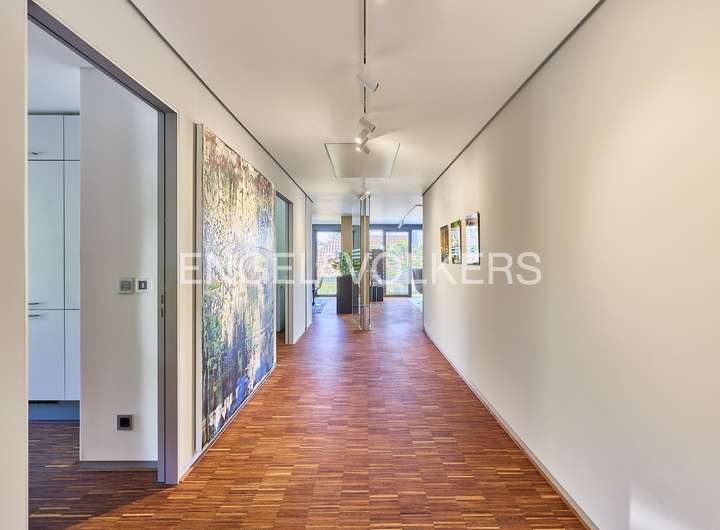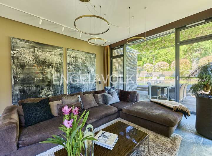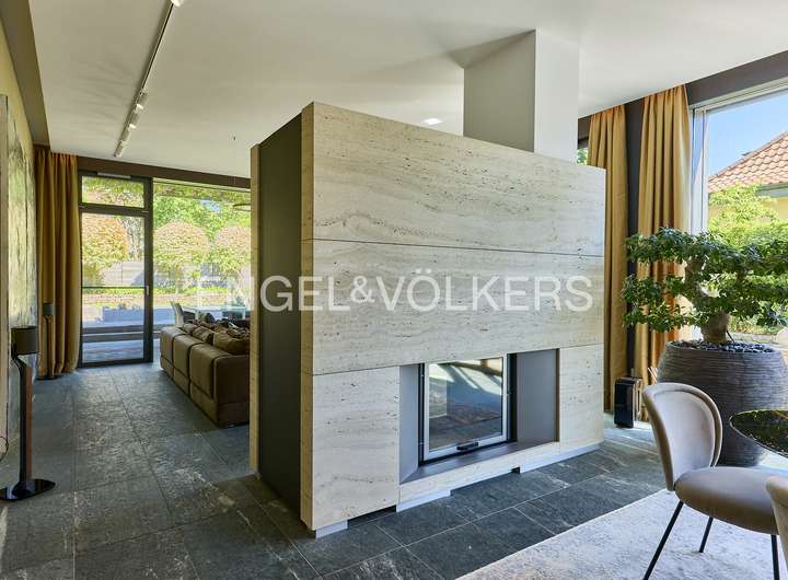 Ein großer Wohn- & Essbereich mit Kamin lädt zum Verweilen ein. Durch Panoramafenster mit freiem Blick in den wunderschönen & privaten Garten fällt viel Tageslicht herein und verstärkt die warme und avantgarde Wohnatmosphäre. In der angrenzenden Küche finden Sie eine moderne Bulthaup-Küche mit großzügiger Kochinsel und vielen Highlights für jeden Kochliebhaber.