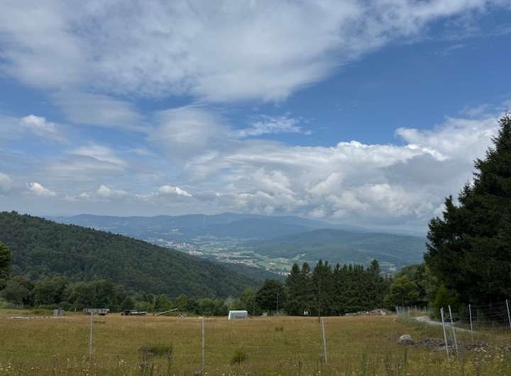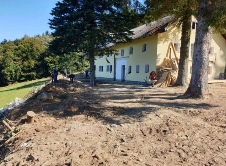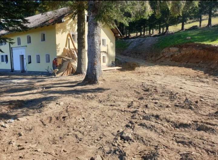 Durch die für ca. 2 Jahre unterbrochenen Abbrucharbeiten macht das Grundstück einen leicht verwilderten Eindruck. Die ursprünglichen Fotos lassen die Möglichkeiten auf der Lichtung im Bayerischen Wald erahnen.