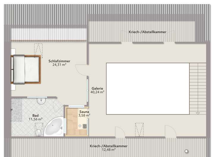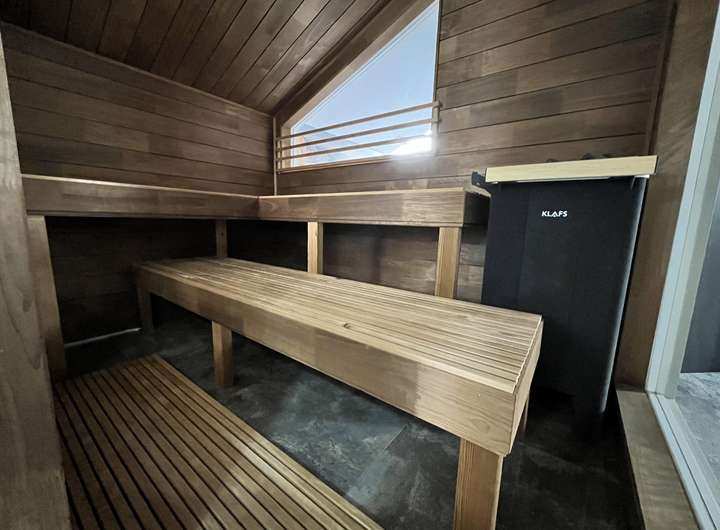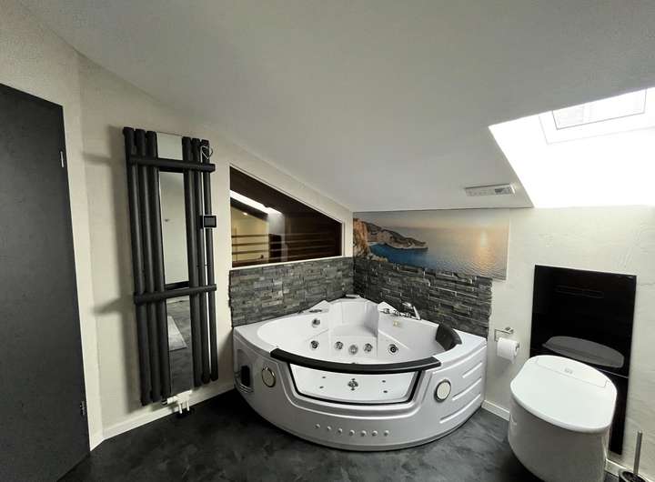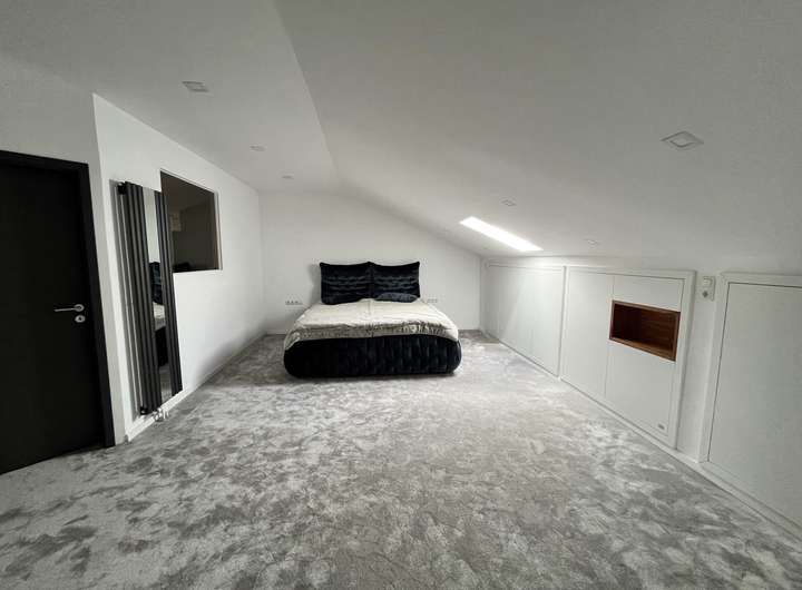 Das Loft ist offen und weitläufig gestaltet – mit einer Galerieebene, einem erhöhten Küchenpodest, einem privaten Spa-Bereich mit Whirlpool und Sauna sowie smarten technischen Features wie Philips Hue Beleuchtung, App-gesteuerter Haustechnik und integrierter Bose-Soundanlage (optional zu erwerben).