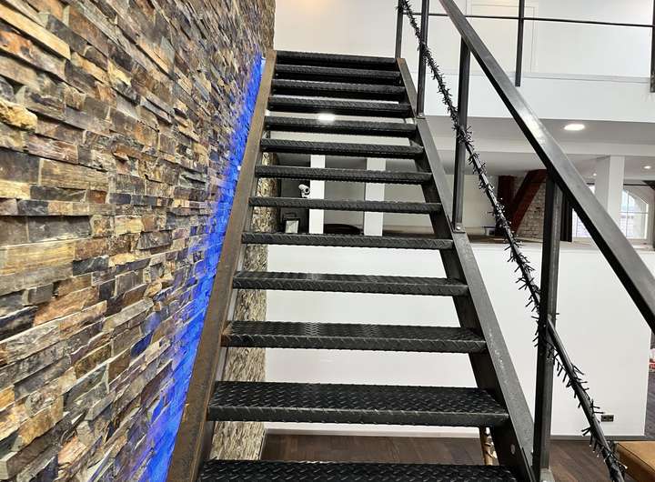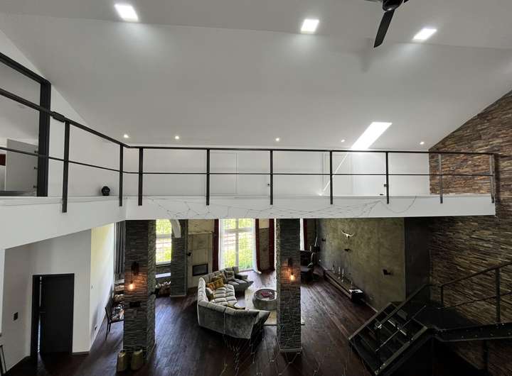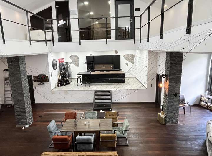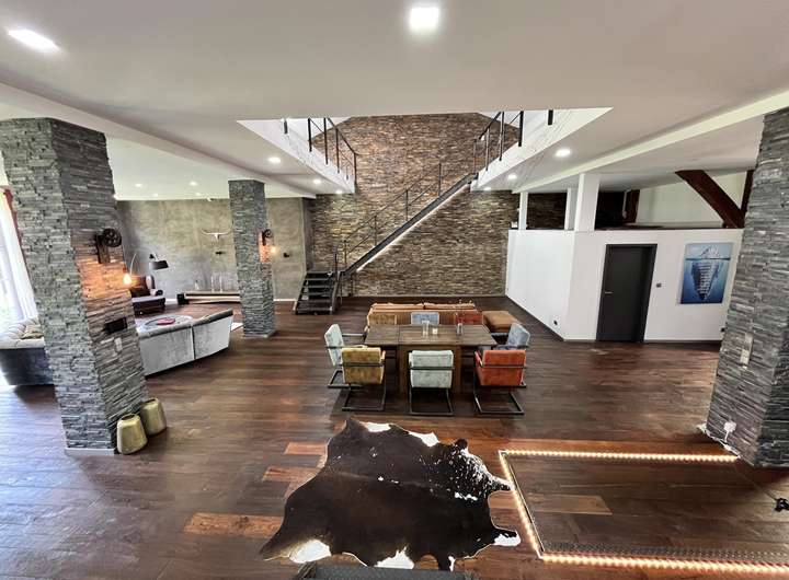 Bis zu 6,50 m Deckenhöhe, massiver Eichenboden, freigelegte Stahlträger, afrikanischer Naturstein und maßgefertigte Schreinerelemente aus Olivenholz schaffen eine Atmosphäre, die modern, exklusiv und zugleich warm wirkt.