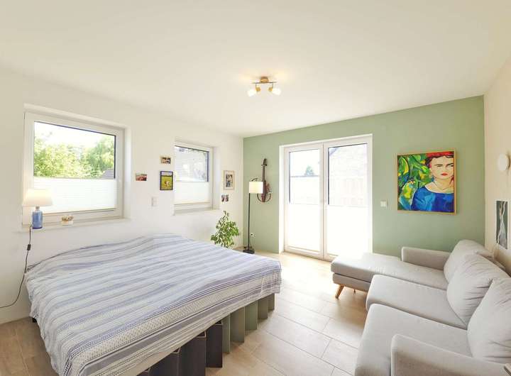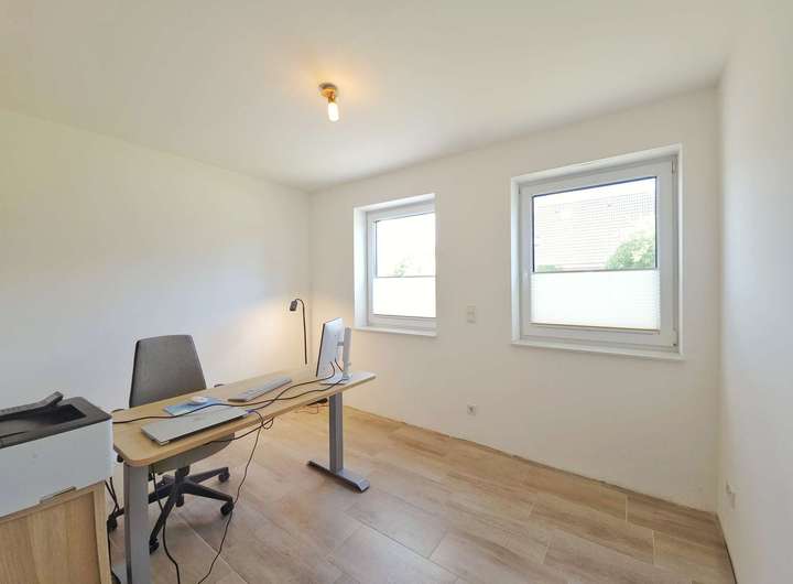 Ein Schlafzimmer sowie ein separates Büro bieten im Erdgeschoss viel Flexibilität – sei es für Gäste, Homeoffice oder als Rückzugsort. Abgerundet wird diese Etage durch ein modernes Gäste-WC sowie einen praktischen Hauswirtschaftsraum mit direktem Zugang in den Garten.