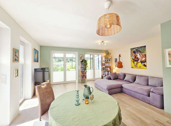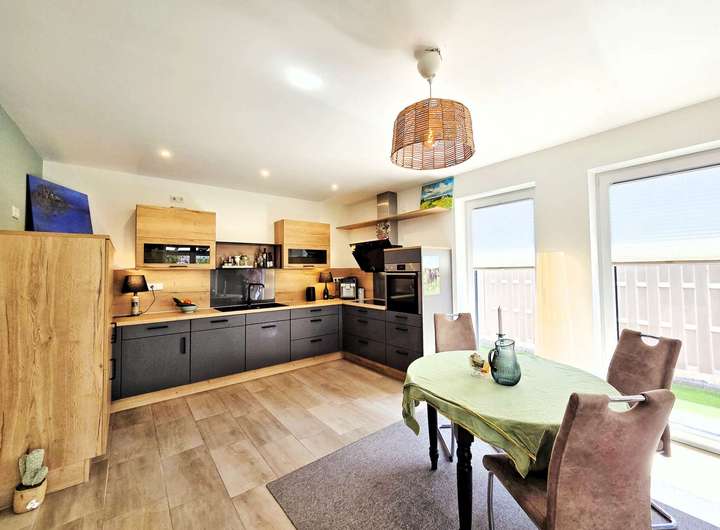 Bereits beim Betreten spüren Sie die Offenheit und Helligkeit dieses Hauses. Der großzügige Wohn- und Essbereich mit offener Küche bildet das Herzstück des Erdgeschosses. Bodentiefe Fenster sorgen nicht nur für ein angenehmes Raumgefühl, sondern führen auch direkt auf die überdachte Sonnenterrasse in sonniger Südwestlage – ideal für entspannte Abende im Freien oder gesellige Stunden mit Familie und Freunden.