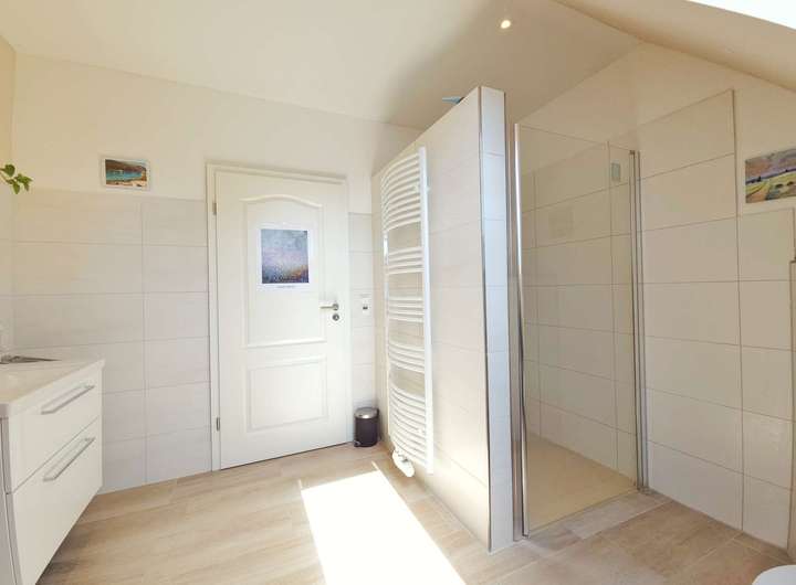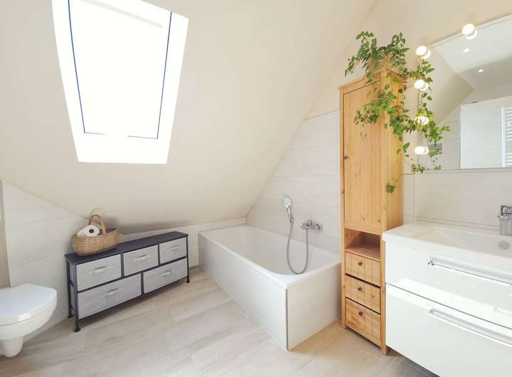 Über eine elegante Holztreppe gelangen Sie ins Obergeschoss. Dort erwarten Sie zwei großzügig geschnittene Schlafzimmer sowie ein stilvolles Badezimmer mit Dusche und Badewanne – eine perfekte Kombination aus Funktionalität und Wohlfühlatmosphäre. Der Dachboden bietet zusätzliche Abstellmöglichkeiten,lediglich der Boden darf noch ausgelegt werden.
