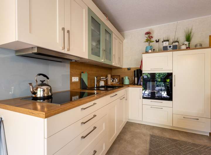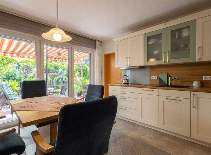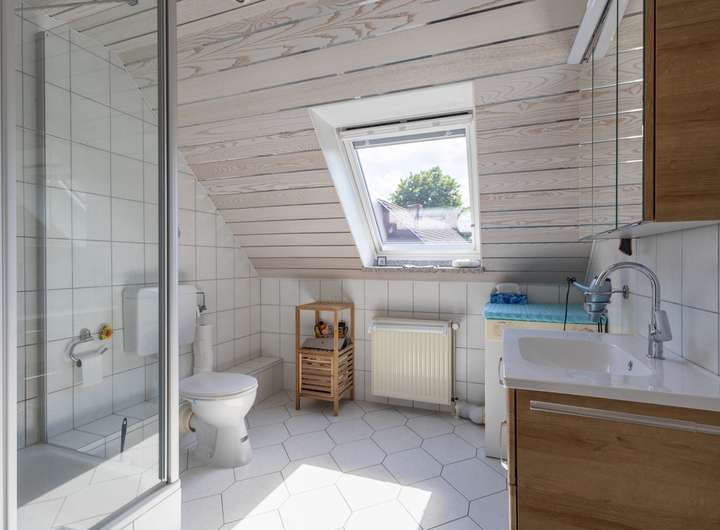 Das Herzstück der Immobilie bildet die moderne Einbauküche aus dem Jahr 2020, ausgestattet mit hochwertigen Miele-Geräten – ein echtes Highlight für Kochliebhaber. Die Beheizung des Hauses erfolgt über eine effiziente Buderus-Gastherme aus dem Jahr 2018 in Kombination mit einem 300-Liter-Warmwasserspeicher. Im Jahr 2023 wurde zudem das Badezimmer im Dachgeschoss durch den Einbau neuer Badmöbel und einer Glasduschabtrennung modernisiert.