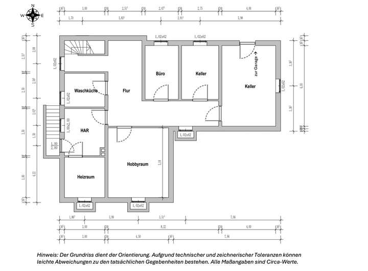 Der vorhandene Keller umfasst einen beheizbaren Waschraum mit Dusche und WC, ein Büro oder Gästezimmer sowie weitere Räume, die sich ideal als Hobby‑, Abstell‑ oder Werkstatträume eignen. Zudem ist der Keller über eine Außentreppe direkt vom Garten aus zugänglich.