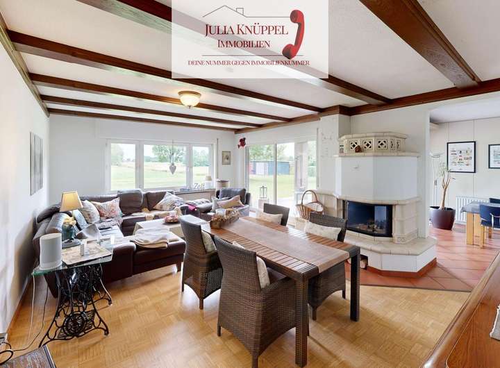 • Großzügiger Wohn-/Ess-/Küchenbereich mit gemauertem Kamin