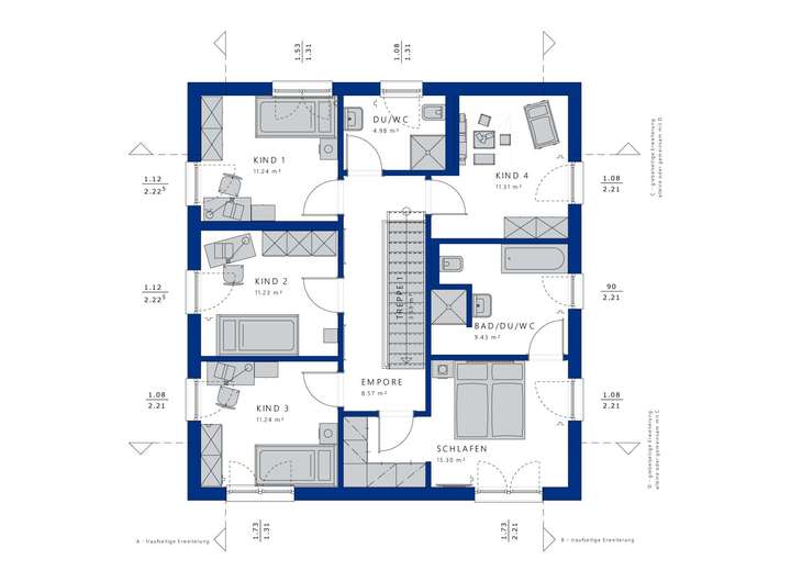 Mit sechs großzügig konzipierten Zimmern bietet dieses Haus ausreichend Platz für die ganze Familie oder Gäste. Die gut durchdachte Aufteilung mit einer Gesamtwohnfläche von 176 Quadratmetern auf zwei Etagen garantiert sowohl gemeinschaftliche als auch private Rückzugsorte. Fünf Schlafzimmer ermöglichen flexibles Wohnen - ob als Elternschlafzimmer mit angrenzendem Kinderzimmer in der Nähe oder als Büro und Gästezimmer - hier findet jeder seinen Platz.