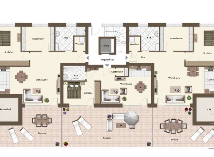 Je nach Lage bietet jede Wohneinheit entweder eine Terrasse mit kleinem Gartenanteil oder einen großzügigen Balkon – jeweils in südlicher Ausrichtung. Die Anbringung einer Markise ist optional möglich.