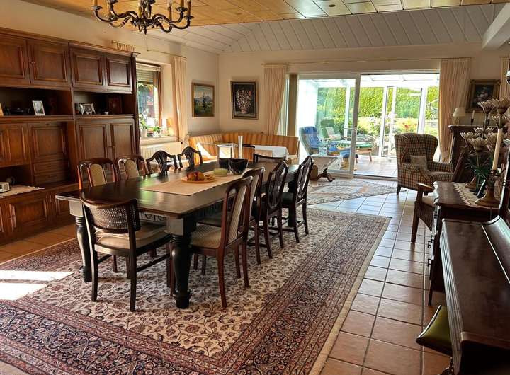 Über 70 m² Wohn-/Essbereich mit Kachelofen und direktem Zugang zum Wintergarten