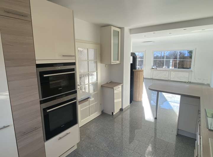 Exklusive Bad/ WC mit Doppelwaschbecken im 1. OG und Badewanne, Luxus- Badezimmer im KG mit Whirlpool und Rooming- In Dusche sowie WC mit Handwaschbecken im EG mit Naturstein nd Fußbodenheizung, exklusive EBK mit offener Esse, Ceranfeld, Dampfgarer, Geschirrspüler, Backofen usw. von Miele,
