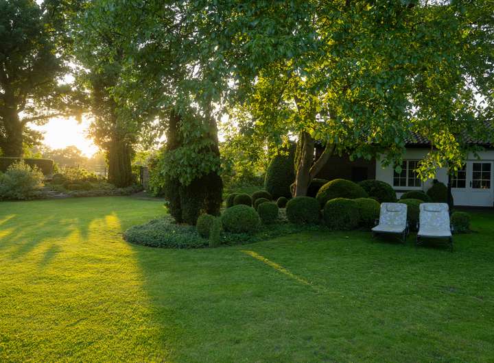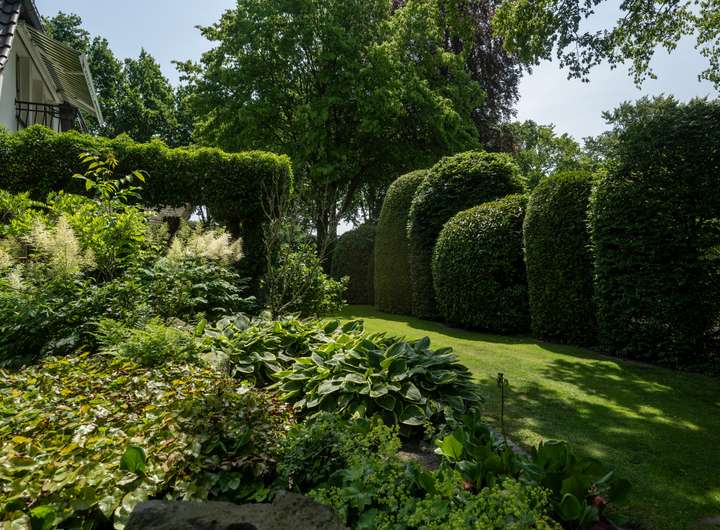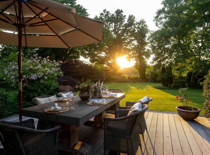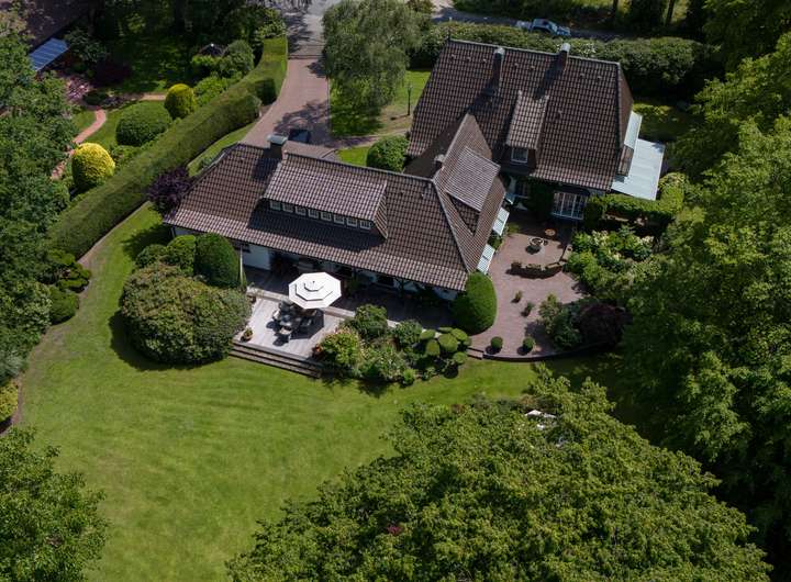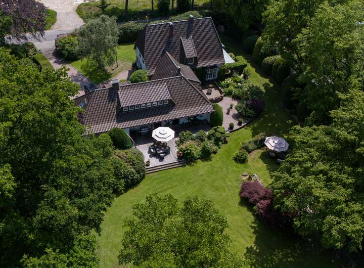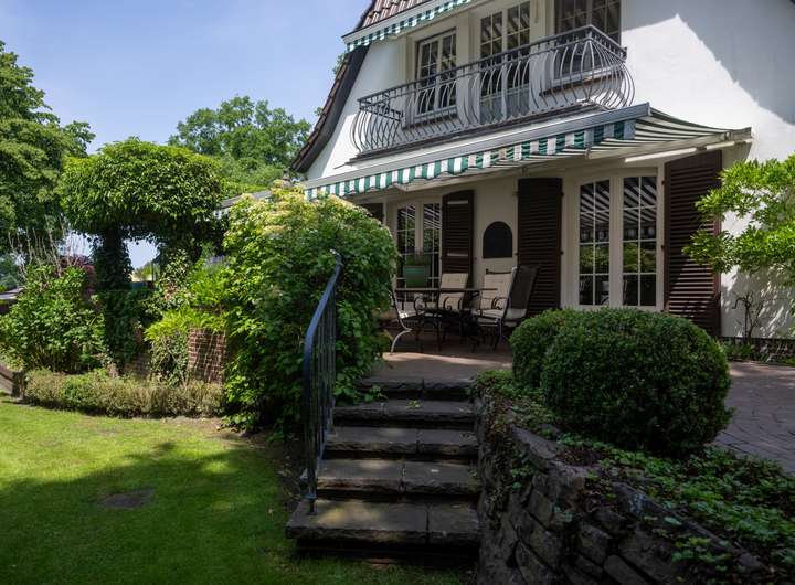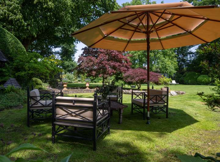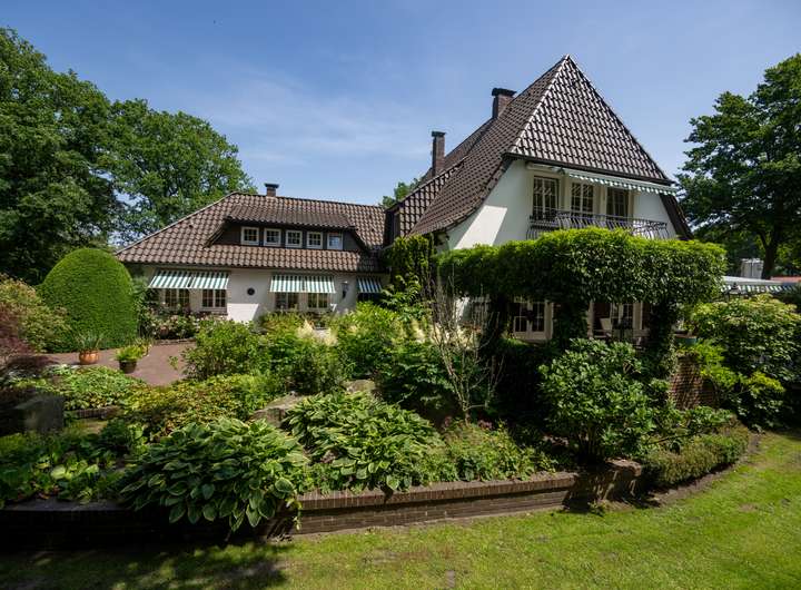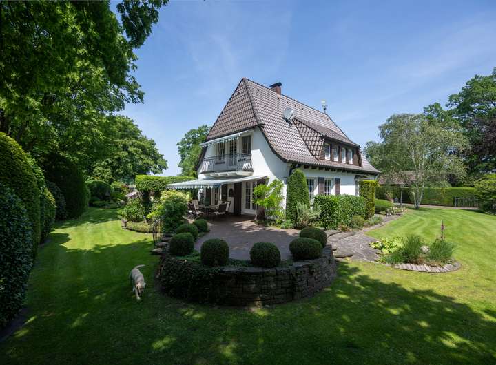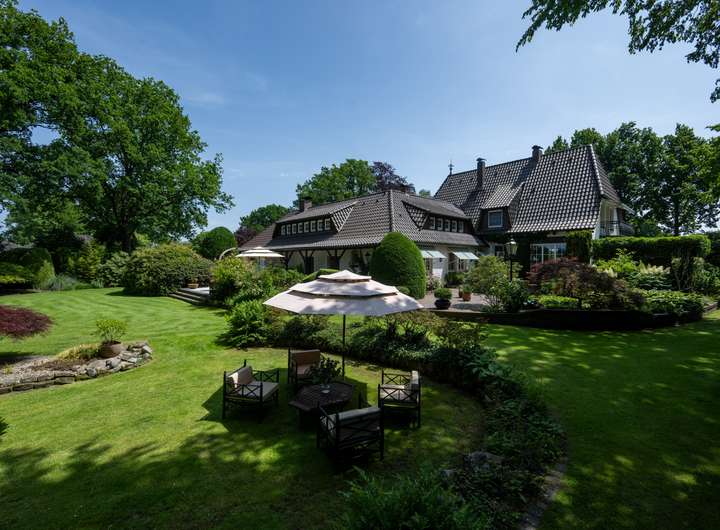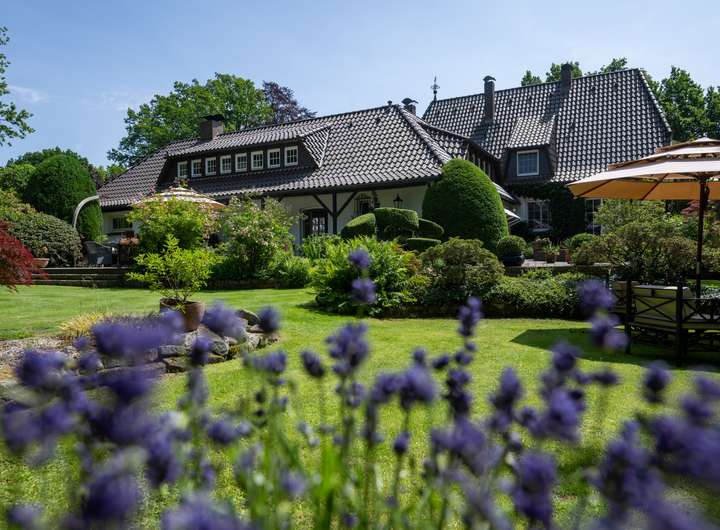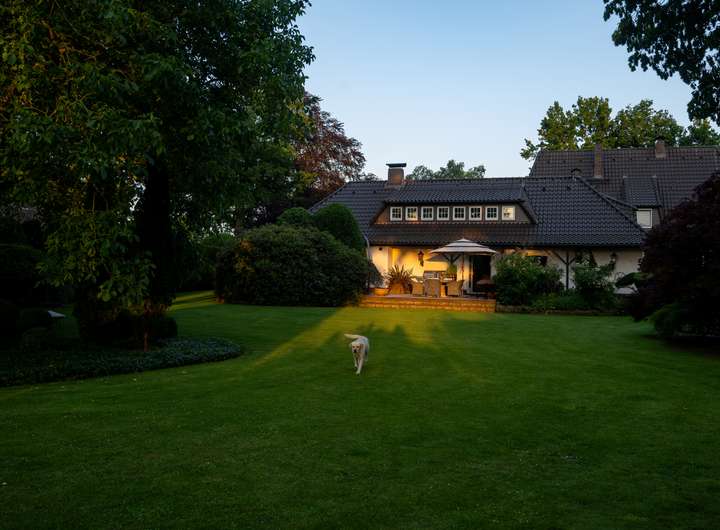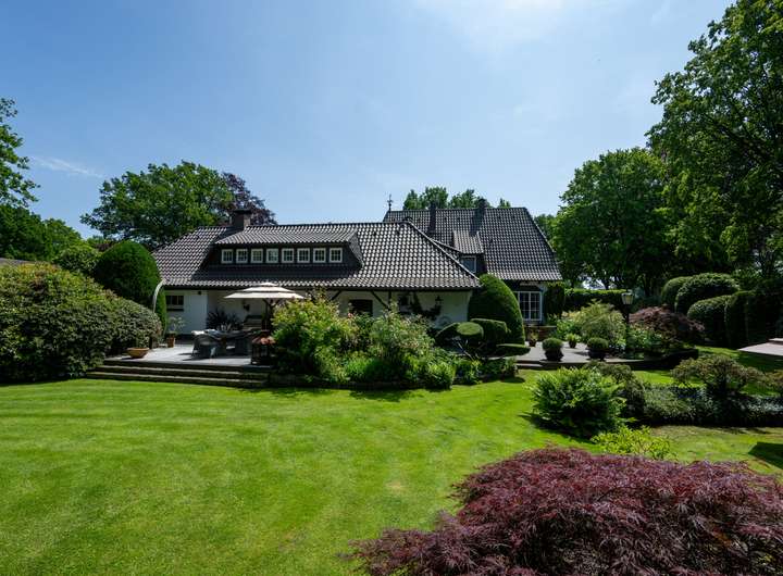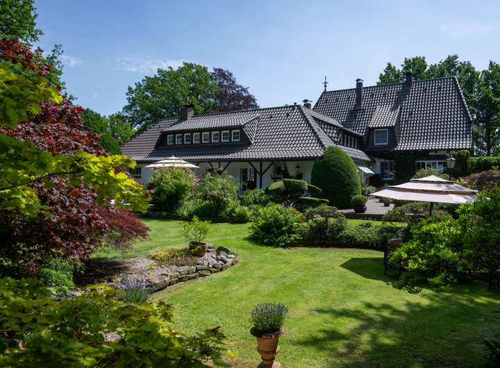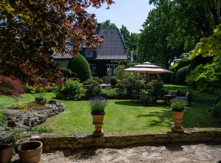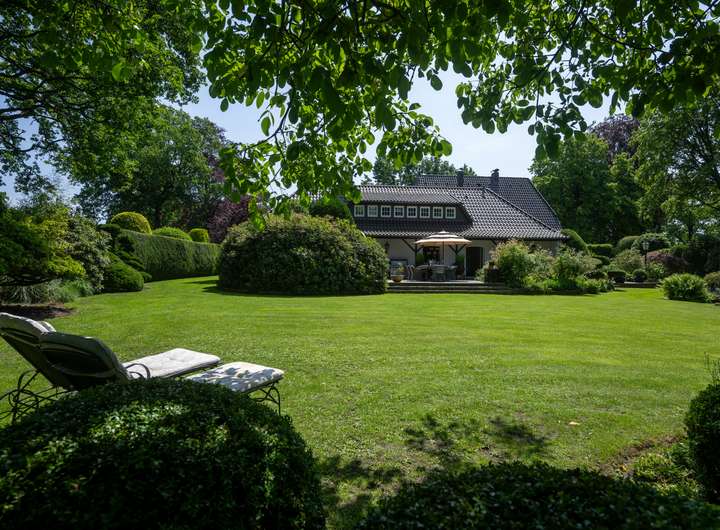 Das über 3.300 qm große, liebevoll angelegte Grundstück bietet absolute Privatsphäre. Mehrere Terrassen, Sitzplätze und Garten-Oasen laden zum Entspannen ein. Eine große, teilweise überdachte Hauptterrasse schafft den perfekten Übergang zum Wohnbereich.
