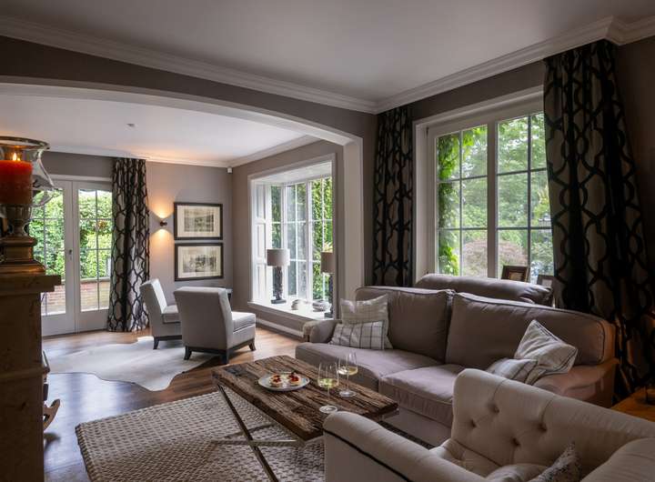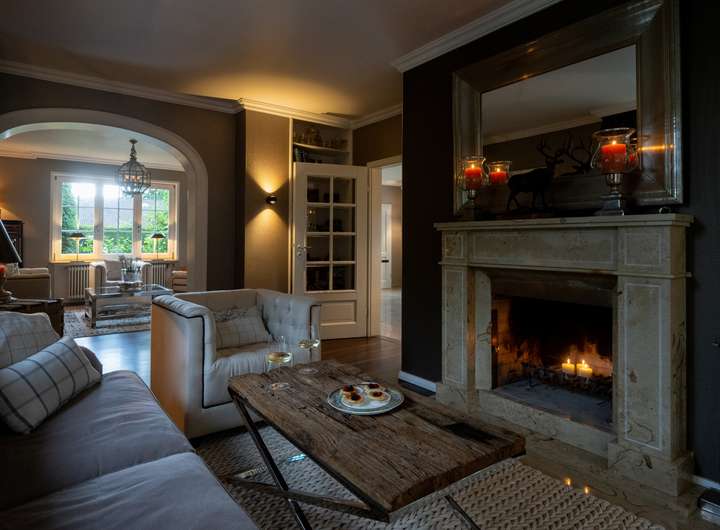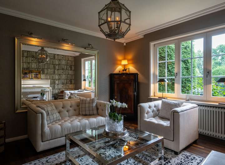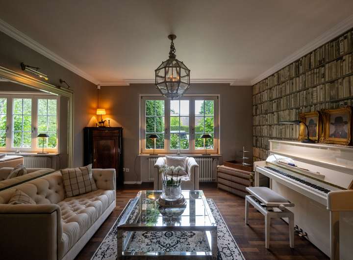 Bereits beim Betreten beeindruckt die elegante Villa durch ihre klare und offene Architektur. Große Fensterflächen schaffen helle Wohnräume und eröffnen malerische Ausblicke auf die Natur. Der Wohnbereich mit offenem Kamin lädt zu behaglichen Stunden ein, während die hochwertige Wohnküche mit zweitem Kaminofen, Markengeräten, Gaskochfeld und direktem Terrassenzugang ideal für geselliges Kochen mit Familie und Freunden ist.