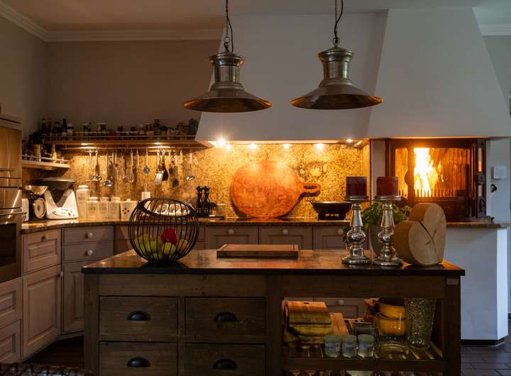 - Offene Wohnküche mit Kaminofen, Markeneinbaugeräten (Miele, Imperial), großem Kochfeld und zusätzlichem Gas-Kochfeld
