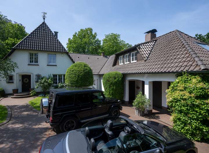 - Repräsentative Einfahrt mit elektrischem Einfahrtstor, großer Auffahrt und Doppelgarage