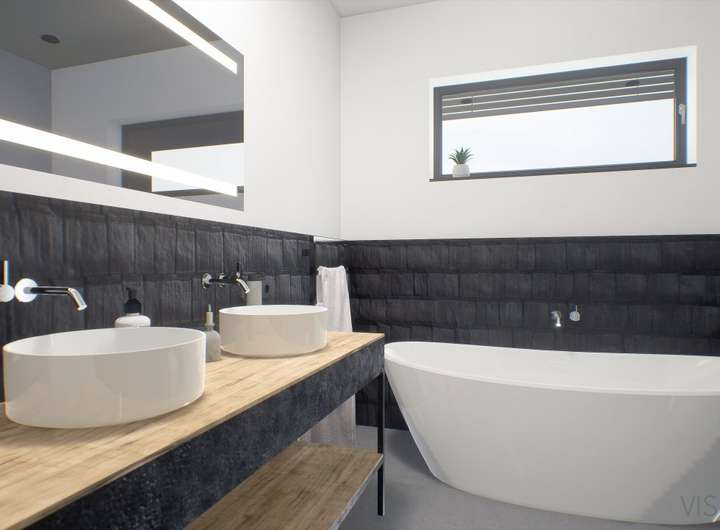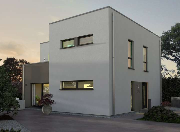 Die versetzten Elemente an der Fassade und der optisch eingesetzte Würfel runden das stilvolle Erscheinungsbild gekonnt ab. Hell und weitläufig erstreckt sich die untere Etage mit großzügigem Raumkonzept.