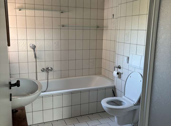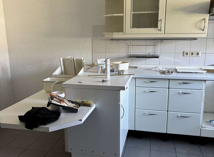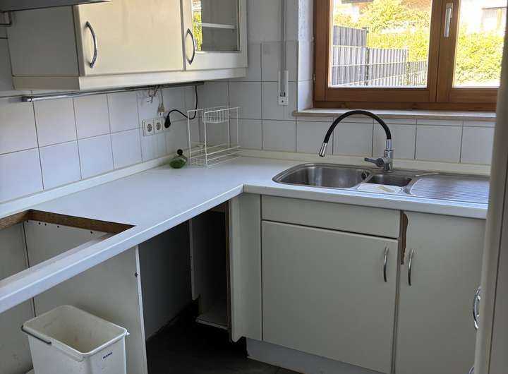 Im Eingangsbereich, Küche und Wohnzimmer Fliesenboden, alle Schlaf- und Kinderzimmer sind derzeit mit Teppichboden verlegt, der seinem Alter entsprechend aussieht. Die Einbauküche ohne Elektrogeräte zeigt altersentsprechende Abnutzung und kann verwendet werden oder Sie weicht.