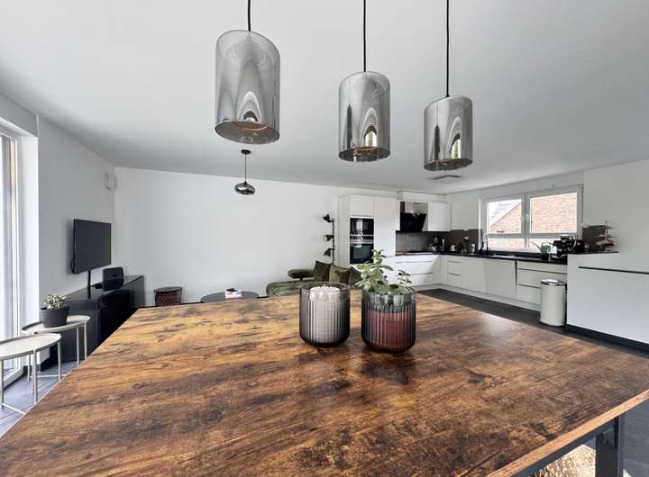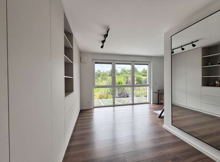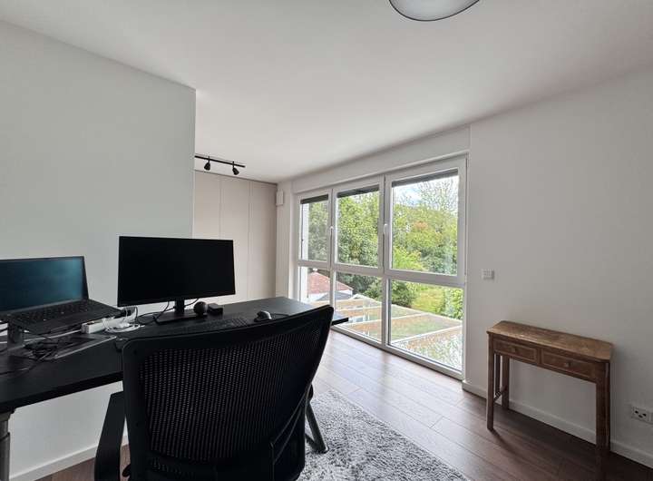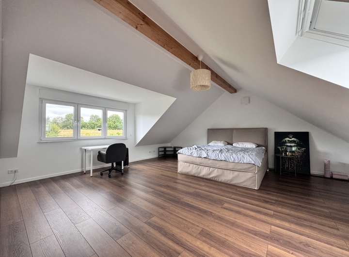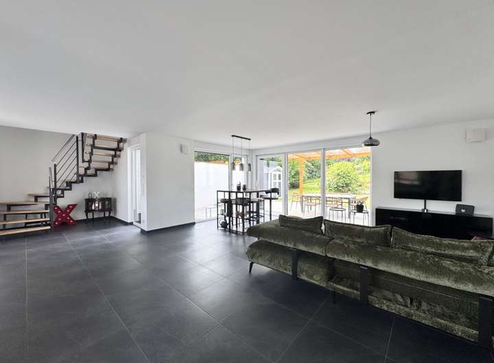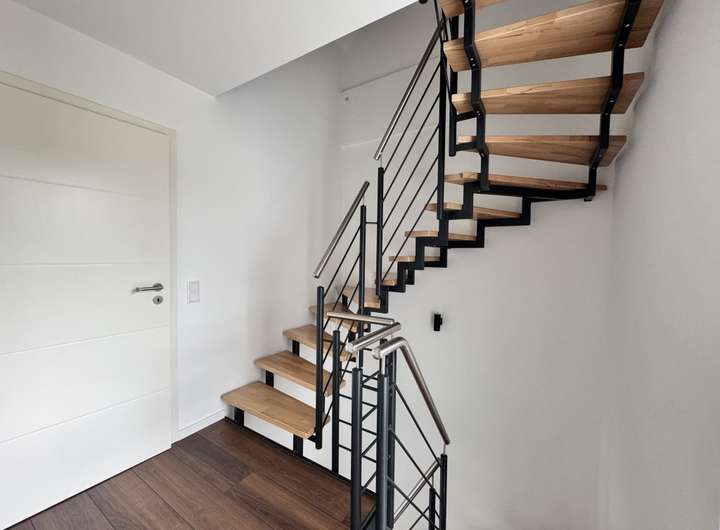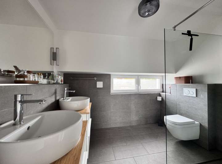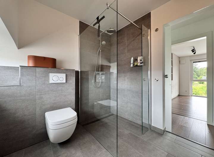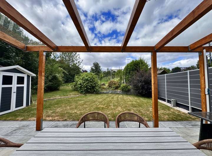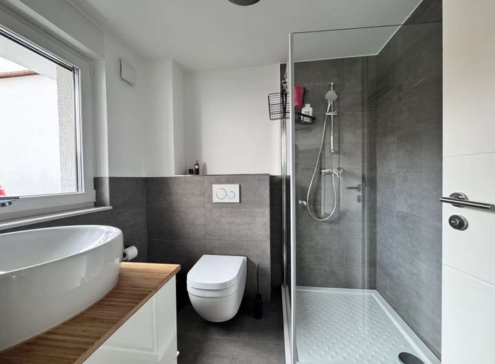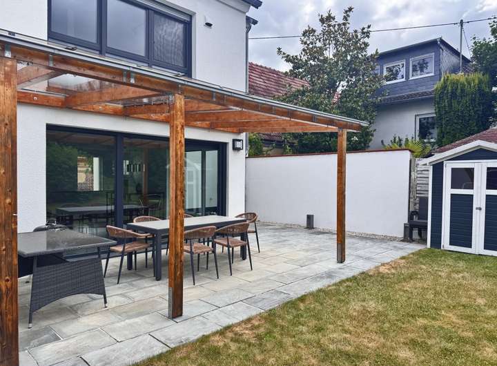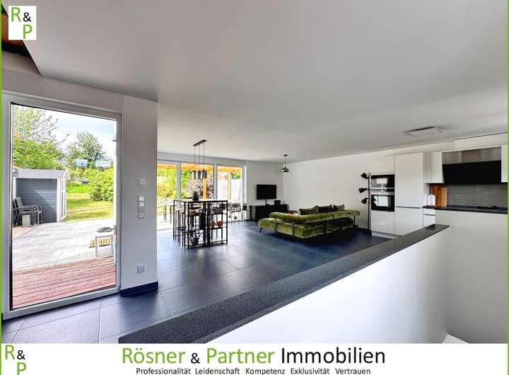 Dieses moderne Reihenendhaus am Ende einer kleinen, charmanten Wohnhausgruppe mit nur drei Einheiten (Realteilung) bietet das perfekte Zuhause für alle, die Ruhe, Licht und Lebensqualität miteinander verbinden möchten. In zweiter Reihe gelegen und direkt an Felder und Natur grenzend, genießen Sie hier eine wunderbar entspannte Wohnatmosphäre. Bereits beim Bau im Jahr 2016 wurde besonderer Wert auf Qualität gelegt. Eine massive Bauweise mit Poroton-Ziegeln sorgt für ein dauerhaft angenehmes und natürliches Wohnklima. Der Eingang zu Ihrem neuen Zuhause befindet sich in einem ruhig gelegenen, stilvoll gepflasterten Innenhof. Hier stehen Ihnen auch zwei Pkw-Stellplätze direkt am Haus zur Verfügung. Der durchdachte Grundriss und die moderne Gestaltung des Hauses werden Sie begeistern. Die mit großen Fliesen ausgestattete Eingangsebene bietet neben einem modernen Tageslichtbad mit großer Dusche auch einen Wasch- und Technikraum, einen geräumigen Keller mit Fenster sowie ein flexibel nutzbares Zimmer, das sich ideal als Gäste-, Kinder- oder Arbeitszimmer eignet. Eine moderne Granittreppe führt hinauf in das lichtdurchflutete Erdgeschoss, das Herzstück des Hauses. Der offen gestaltete Wohnbereich mit Küche und Essplatz erstreckt sich über mehr als 50 Quadratmeter und begeistert mit Großzügigkeit, klaren Linien und fließenden Übergängen. Große, raumhohe Fensterflächen und eine breite Schiebetür lassen viel Tageslicht herein und verbinden den Innenraum harmonisch mit der sonnigen Terrasse aus Naturstein. Sie erweitert den Wohnraum optisch und ist mit einer gemütlichen Pergola aus Holz und Glas überdacht, perfekt für entspannte Stunden im Freien, vom Frühstück bis zum Abendessen im Sommerlicht. Die hochwertige, weiße Einbauküche mit allen elektrischen Geräten ist im Preis enthalten und wird durch eine praktische Vorratskammer ergänzt. Das erste Obergeschoss erreichen Sie über eine freitragende Treppe. Hier befinden sich zwei ruhige, helle Zimmer, nutzbar als Schlaf-, Kinder- oder Arbeitszimmer, sowie ein elegantes Tageslichtbad mit großer, ebenerdiger Dusche, zwei Einzelwaschbecken und stilvollen Armaturen. Eine zusätzliche Abstellkammer bietet wertvollen Stauraum. Ein maßgeschneiderter Einbauschrank vom Schreiner, eingebaut im Jahr 2025, steht im Schlafzimmer zur Verfügung und ist im Preis enthalten. Das Dachgeschoss ist als großzügiges Studio ausgebaut, offen, hell und vielseitig nutzbar. Eine breite Gaube mit drei großen Fenstern sowie ein zusätzliches Dachflächenfenster lassen viel Tageslicht herein und schaffen eine angenehme, wohnliche Atmosphäre. Auch hier wurde 2025 ein hochwertiger Einbauschrank vom Schreiner integriert. Eine Klimaanlage sorgt selbst an heißen Sommertagen für ein angenehmes Raumklima. Zusammengefasst präsentiert sich dieses Haus in einem sehr gepflegten, nahezu neuwertigen Zustand. Anfang 2025 wurden sämtliche Innenwände frisch gestrichen, außerdem wurden in beiden Badezimmern die Duscharmaturen und WC-Becken erneuert. Die durchgehend verlegte Fußbodenheizung schafft in allen Räumen ein behagliches Wohngefühl. Dreifach verglaste Fenster bieten eine gute Energieeffizienz, ideal für alle, die Komfort und Nachhaltigkeit zu schätzen wissen. Ein überzeugendes Gesamtpaket aus moderner Architektur, solider Bauweise, hochwertiger Ausstattung, viel Licht, großzügigem Raumangebot und ruhiger Lage im Grünen. Perfekt für Familien oder Paare, ein Zuhause zum Ankommen und Wohlfühlen. Vereinbaren Sie gerne Ihren persönlichen Besichtigungstermin. Das Team von Rösner und Partner freut sich darauf, Ihnen dieses schöne Haus vorzustellen und Sie auf dem Weg in Ihr neues Zuhause zu begleiten.