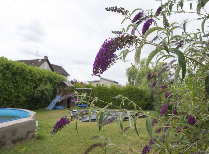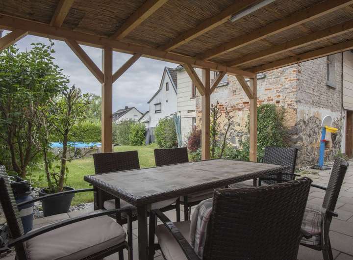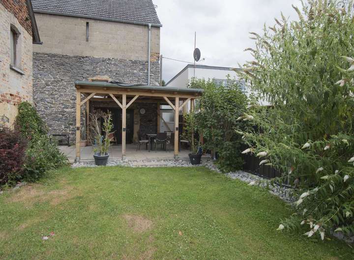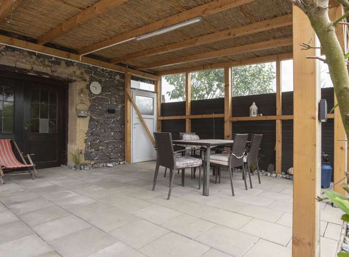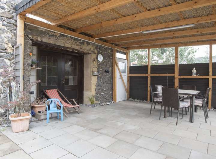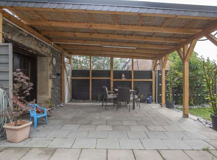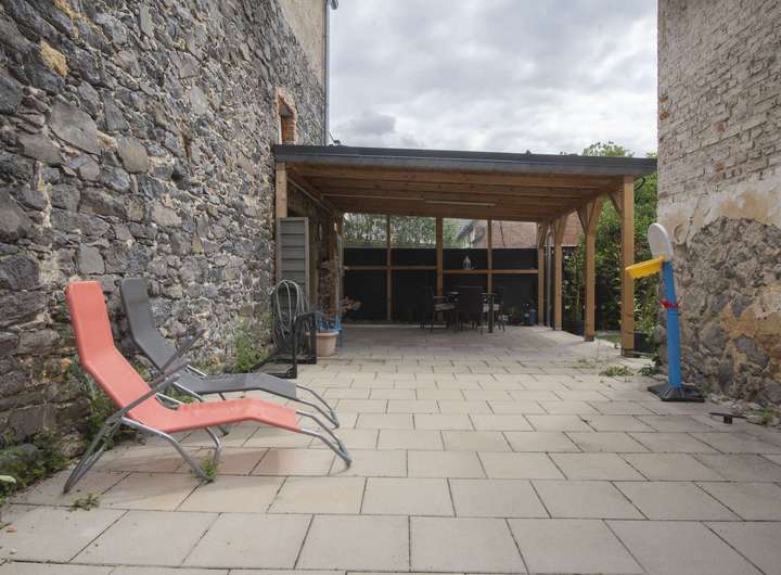 Die aktuellen Eigentümer haben über die gesamte Breite der Scheune eine riesige, teils überdachte Gartenterrasse entstehen lassen.