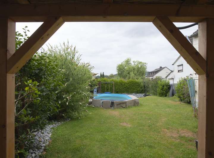 TERRASSE (teilüberdacht). SAUNAHAUS. GARTENPOOL.