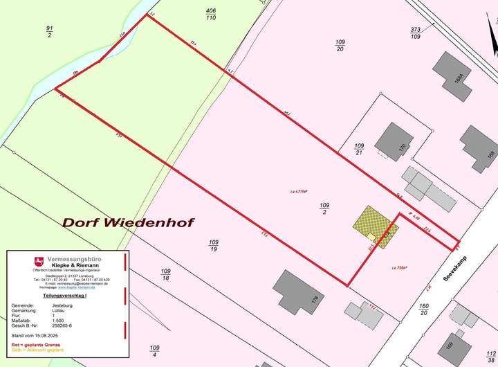 In beliebtester Lage von Jesteburg, im schönen Ortsteil Wiedenhof, befindet sich dieses beeindruckende Grundstück mit einer Größe von ca. 4.710 m². Es grenzt direkt an die alte Seeve und das Naturschutzgebiet mit den unverbaubaren Seevewiesen - ein Traum! Geschmackvoll und repräsentativ zeigt sich besonders die Nachbarschaft Richtung Süd-West - Reetdachhäuser und schicke Landhäuser präsentieren sich auf adäquaten Grundstücken. Bebaubar ist das Grundstück gemäß positivem Bauvorbescheid in jedem Fall mit einem Einfamilienhaus mit einer Grundfläche von ca. 140 m² zzgl. Doppelgarage. Es existiert kein Bebauungsplan, somit orientiert sich die Bebauungsmöglichkeit an der Nachbarschaft. Vom Baustil ist hier alles möglich. Auch ein 2-geschossiges Haus ist denkbar. Die Firsthöhe sollte laut der Gemeinde 9 m nicht übersteigen. Die hintere Baulinie befindet sich ca. 45 m von der Straße aus gesehen. Die Leitungen für Gas, Wasser, Strom und schnelles Internet befinden sich in der Straße. Abwasserkanal ist nicht vorhanden, somit muss eine vollbiologische Kleinkläranlage errichtet werden. Es befindet sich ein Altbaubestand auf dem Grundstück. Sie können sich dieses Grundstück wunderschön parkartig gestalten mit Blick in die Natur. Die Abriss- und Rodungskosten gehen zu Lasten des Käufers. Ein besonders reizvolles Grundstück, das seinesgleichen sucht!