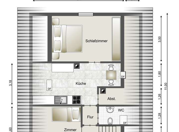 - Jährliche Kaltmiete (Ober- und Dachgeschoss): ca. 14.400 €