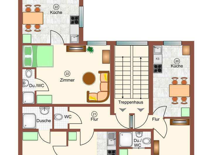 Die Immobilie umfasst 15 komplett sanierte und hochwertig möblierte Wohnungen mit Einbauküchen und modernen Duschbädern. Einige Wohnungen sind zusätzlich mit Kaminöfen ausgestattet. Die Wohnungen werden derzeit an Geschäftsleute (keine Monteure, keine Studenten) auf Zeit vermietet.