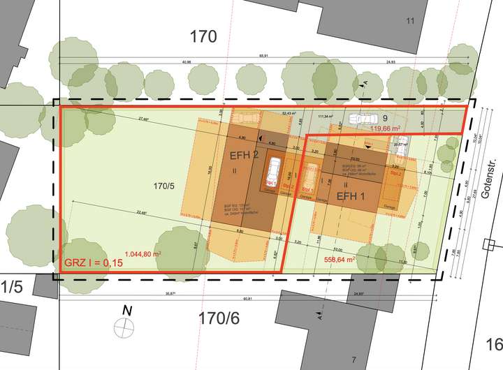 Das zum Verkauf stehende Grundstück umfasst ca. 1.721 m². Ein positiver Bauvorbescheid bestätigt die Möglichkeit, zwei Wohneinheiten zu errichten. Das östlich gelegene Vordergrundstück ist nicht Bestandteil dieses Angebots.