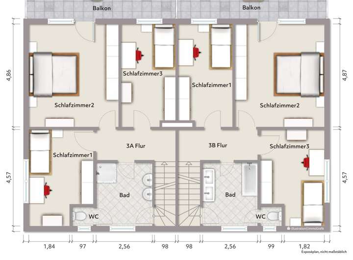 Obergschoss: 3 Schlafzimmer, Bad, Flur; Balkon