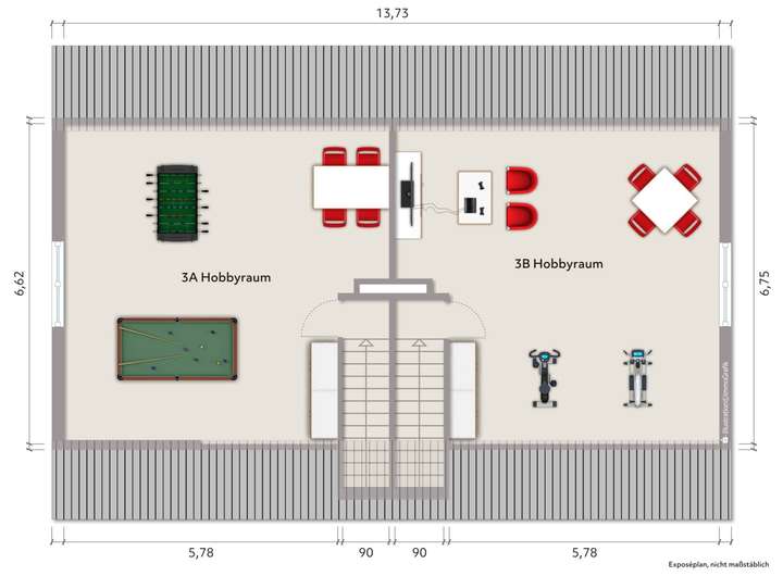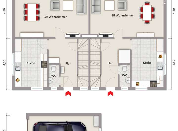 Die beiden Doppelhaushälften sind nahezu identisch aufgebaut und verfügen im Erdgeschoss über je ein großes Wohnzimmer mit anliegender teilüberdachter Terrasse, einer separaten Küche und einem Gäste-WC. Im oberen Geschoss befinden sich drei Schlafzimmer, wobei das größte hiervon sogar einen Zugang zum Balkon hat und einem großen Tageslichtbad. Der unausgebaute Spitzboden kann durch eine Treppe im Badezimmer erreicht werden und hat enormes Potential für weitere Nutzungen.
