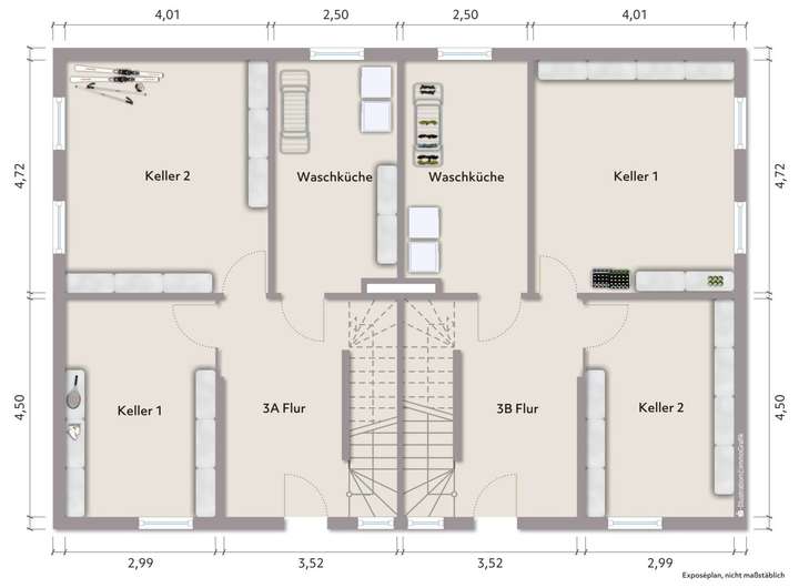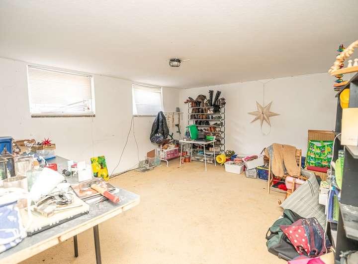 Die Kellerräume bieten viele Möglichkeiten, unter anderem als Lager, aber auch Waschmaschine und Trockner finden hier Platz, sowie die Heizungsanlage der jeweiligen Haushälfte befinden sich dort. Der Außenzugang ist super praktisch, damit auch größere Gegenstände im Keller untergebracht werden können. Ein gemeinsamer Kellerraum für beide Hälften zusammen beinhaltet die jeweiligen Zähler.