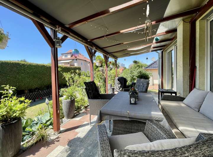 Ein weiteres Highlight ist die überdachte Terrasse, die sich harmonisch an das Wohnensemble anschmiegt und in den liebevoll angelegten Garten übergeht. Ob beim Frühstück im Sonnenschein, beim Lesen oder beim abendlichen Glas Wein – dieser Rückzugsort verspricht Ruhe und Entschleunigung.