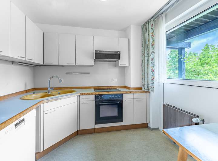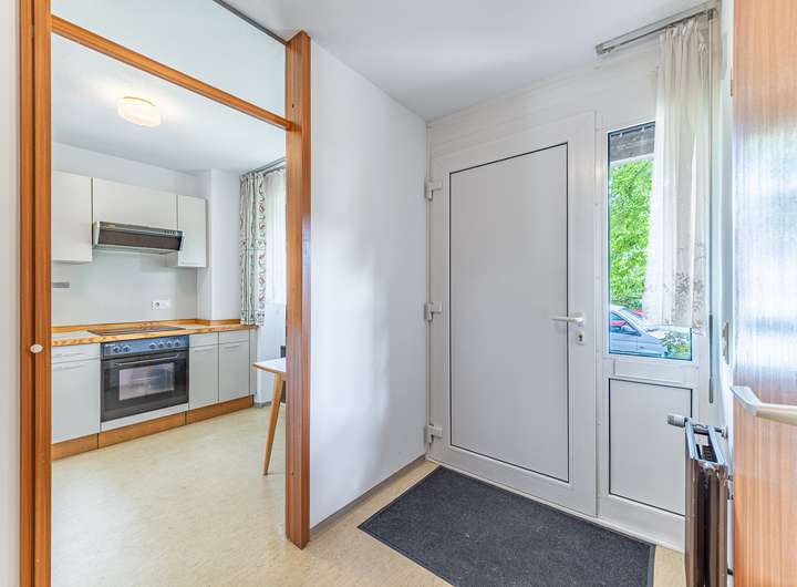 Schon beim Betreten des Hauses empfängt Sie ein heller und freundlicher Eingangsbereich, der einen angenehmen ersten Eindruck vermittelt. Direkt angrenzend befindet sich die praktische Küche mit Fenster – hell, gut belüftet und ideal zum Kochen mit Tageslicht. Ein Gäste-WC rundet den Eingangsbereich sinnvoll ab.