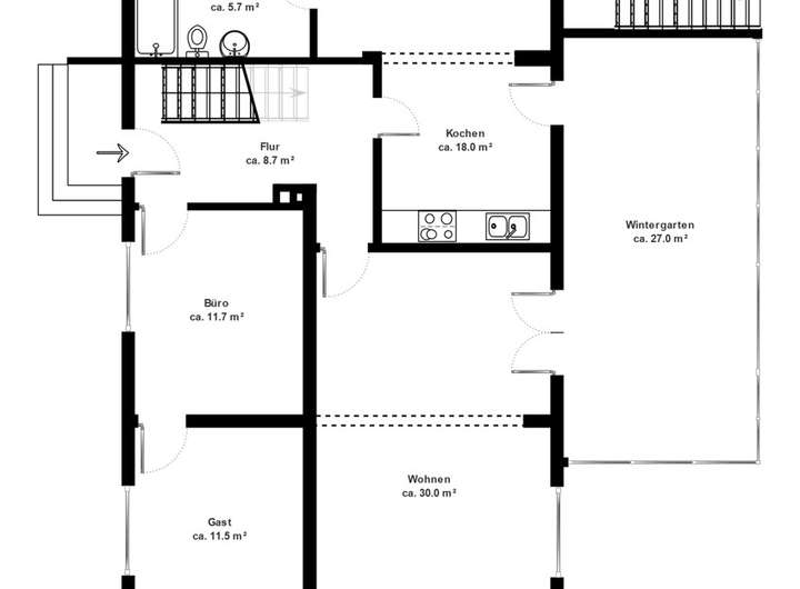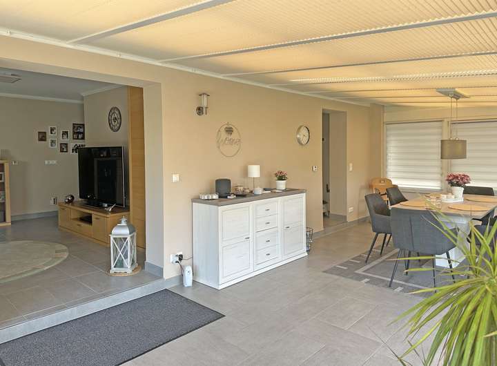 Im Rahmen der Kernsanierung (2011–2012) wurde das Haus umfassend modernisiert und erweitert. Im Wohnzimmer sowie im Wintergarten wurden geschmackvolle und großformatige Fliesen verlegt, die übrigen Räume wurden mit pflegeleichtem Laminat ausgestattet – für ein stimmiges Wohnambiente. Eine moderne und geschmackvolle Einbauküche mit allen erforderlichen Geräten und viel Stauraum bietet Entfaltungsmöglichkeiten für Kochliebhaber. Die Bäder wurden stilvoll neu gestaltet und lassen sich jeweils über ein Fenster gut be- und entlüften. Eine Fußbodenheizung sorgt für eine angenehme Wärme ohne störende Heizkörper. Die Fensterelemente sind isolierverglast, in Kunststoff gefasst und mit Außenrollläden ausgestattet. Große Fensterflächen sorgen für viel Tageslicht und verleihen dem Haus ein offenes, freundliches Ambiente. Die Raumgrößen sind gut proportioniert, was das Wohngefühl zusätzlich unterstreicht.