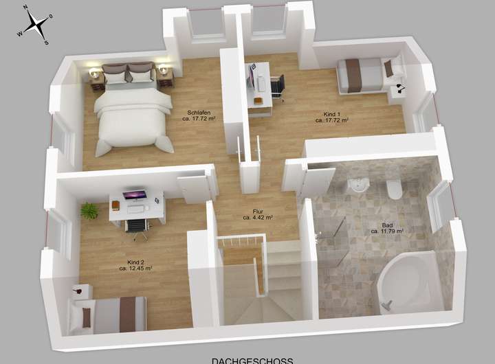 Über eine offene Holztreppe gelangen Sie ins Dachgeschoss (ebenfalls ca. 64 m²) mit: